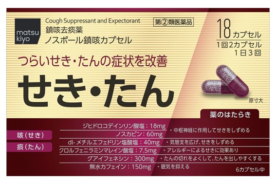 ノスポール鎮咳カプセルは、ジヒドロコデインリン酸塩、dl-メチルエフェドリン塩酸塩、ノスカピン、グアイフェネシンの鎮咳去痰成分を配合したカプセル剤です。つらいせき・痰の症状を改善します。
